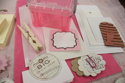 A Really Useful Box will hold all the goodies...hand stamped tags using Take Note, a tag made of corrugated box scraps that's been sprayed with pink Glimmer Mist, Elle's Studio Tags.........
