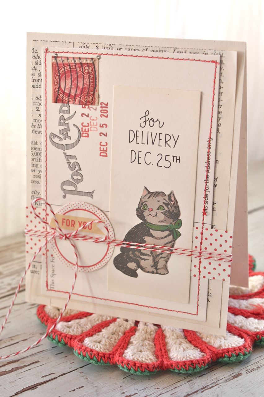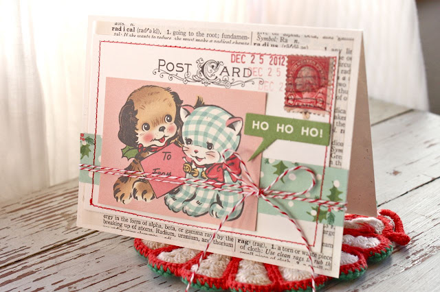I first stitched around all the postcards using red thread. I then layered on strips of other Make it Merry patterned papers, the vintage images, and some Tidbits.I then tied each card with red and white baker's twine. There is something about red and white for the holidays that really appeals to me.